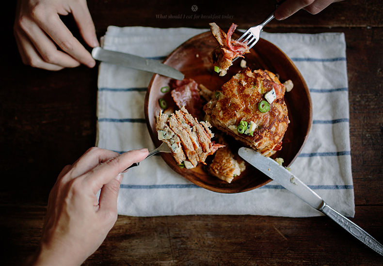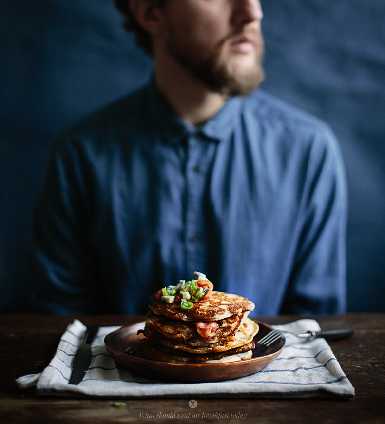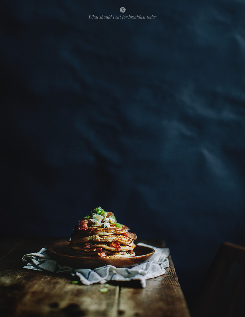 BUCKWHEAT PANCAKES WITH BLUE CHEESE, BACON AND MAPLE SYRUP