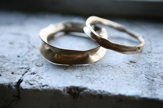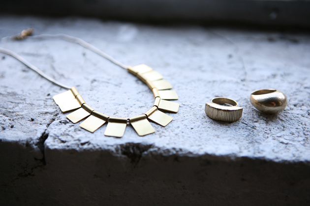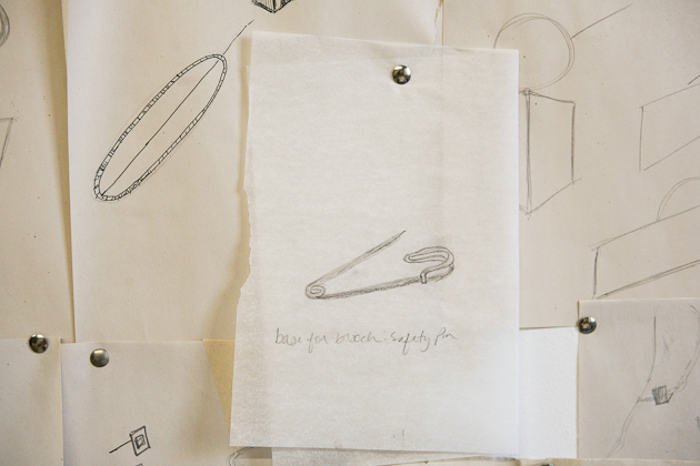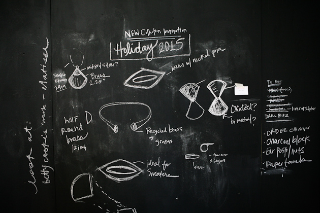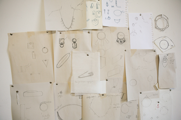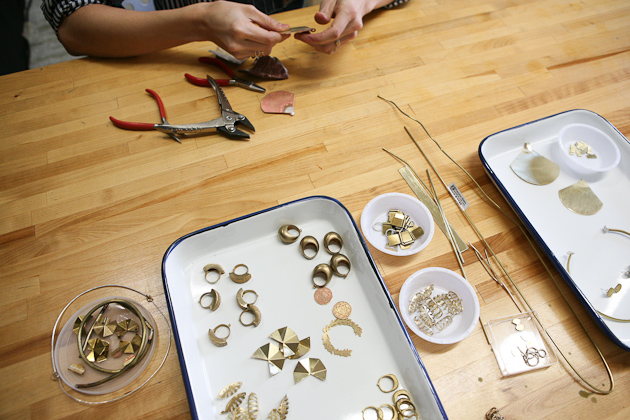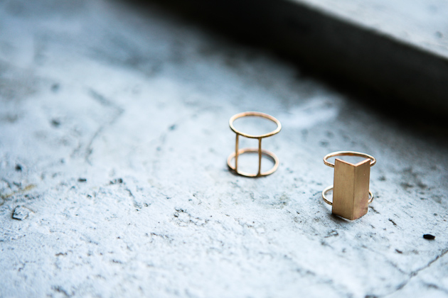 One of my professors told us in undergrad as we were, I’m sure, complaining about an upcoming project, that one day we were going to wish that someone would give us an assignment to complete…and she was totally right. It can be so hard to confront a blank canvas, so to speak, and it helps to have direction. So that’s what I do; I give myself little projects and tasks to complete to get myself in a headspace where I can create well. I take a day or two to search and collect. During this time I usually stay away from things like Google and Pinterest as I find they really cloud my creativity in the beginning. Don’t get me wrong, Google is normally a dear friend, but I think it’s a healthy practice to not solely rely on the internet. I visit museums, libraries, parks, and more. I people watch. I sketch. I take a lot of photos. I eat good food. I do things that give me energy. I then compile everything from those couple of days and do a ton of quick sketching to get some of my initial ideas out. Then all of those sketches get pinned onto the wall because I need to be able to step back and look at what my brain is doing visually. From those findings and sketches, I create a few more developed drawings of pieces that tend to be larger in size and more conceptual. I then make one or two of these into paper models and eventually into metal. This helps me get out some of the crazy, less approachable jewelry ideas I have and provides me with a springboard for smaller, more ‘wearable’ pieces. Usually, an entire collection I release publicly will have come out of a couple of larger pieces that no one ever sees. I love working with gold because it’s a very forgiving metal and obviously beautiful. I have to say, I love brass for it’s color and cheapness, though it can be difficult to work with.
