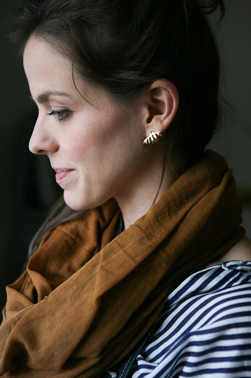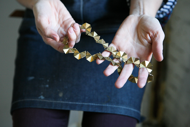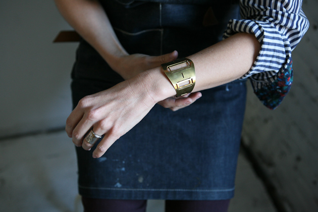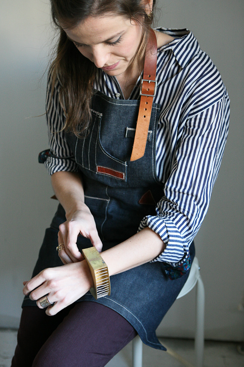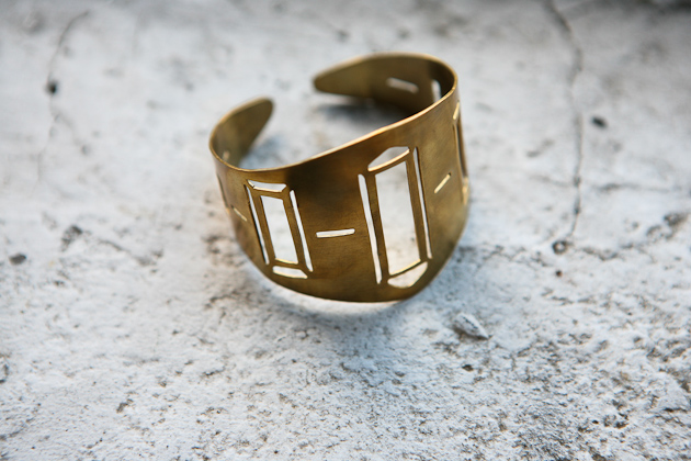 On a crisp and sunny October morning, I make my way from Manhattan to Olivia Terrell’s new studio in Williamsburg, Brooklyn. She is finally starting to feel settled after a trans-atlantic move with her husband from Madrid, Spain, where she lived for the past three years, to her new home in New York City. Her studio space is warm and inviting with the glow of brass jewelry on the walls and halfway filled trays of small pieces in progress on her worktable. Sketches of jewelry designs are pinned to one wall illuminated by a soft light filtering through a large opaque window in the corner of the room. As I take notes during our conversation I am most struck by how articulately she recognizes and expresses the various ways her art has been influenced by her roots, her changing surroundings and her everyday life. Originally from Nashville, Tennessee she mentions her work started out with a more organic feel but moving to Spain changed the flavor of her design. Our conversation leaves me with increased curiosity. I am anxious to see how the influence of this new city will manifest itself in her work.
