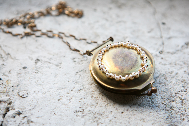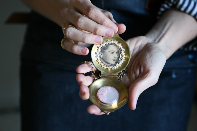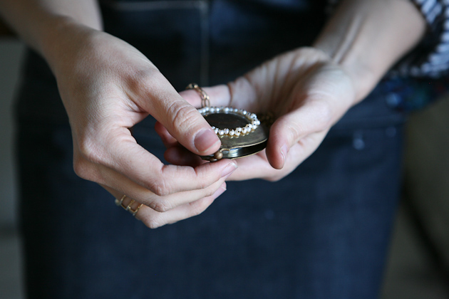 I was in a bit of a creative rut during the time I was supposed to be choosing a direction for the final show of my undergrad degree. I struggled (and still do at times) to try and make something that no one else has done before…to re-create the wheel. I finally realized that there truly is nothing new under the sun, which can seem depressing to a creator-type, but honestly it brought me so much more freedom in the way I approached my work. I think as a young artist, it’s easy to believe that you need to create something one hundred percent new or something utterly profound that no one could possibly understand. I started to be less self-conscious and in turn became more excited about the possibilities for new work. I decided to choose something I knew and that was close to me versus something unknown. I created a body of work around the the culture of the American south and, specifically, what it means to be a female from the south. It was an investigation both objectively, and of my own personal family heritage. I used a quote from one of my favorite authors, Flannery O’Connor, who was a huge inspiration for me, that says, “The Truth does not change according to our ability to stomach it”. I believe there is a lot of value placed on one’s ability to maintain appearances and keep things polished on the surface in the face of conflict or difference, rather than to address an issue for what it is and deal with the pain or awkwardness. All of the pieces I made, though beautiful in appearance, are excessive and precarious to the wearer. I wanted the pieces to ooze sentimentality so I incorporated old watch crystals, time-worn photographs, and pearls. Each piece touches on a different aspect of my investigation. In making the Compact/Locket, I was working through keeping loved ones close to you (as a locket, next to your heart) and yet the simultaneous need to cover up and keep things pretty (as a compact, using blush) despite the intimacy of the relationship.