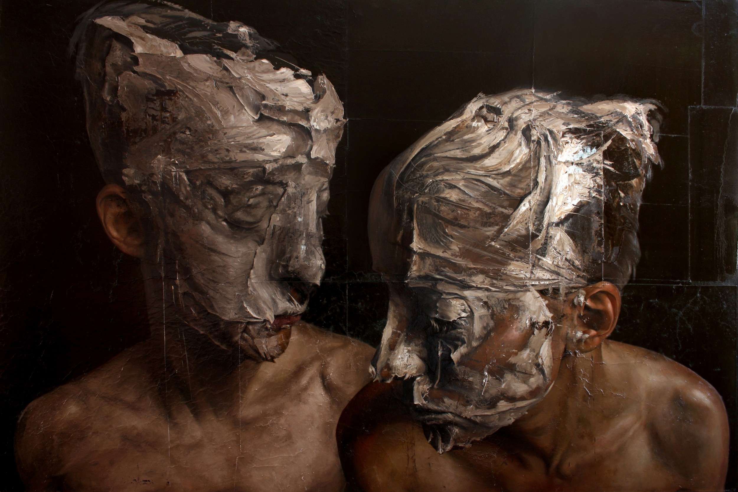 Dario Puggioni’s shrieking bodies are cloaked in a veiled melancholy, in sombre tones which shrink them to flimsy phantoms held up by unsteady bone scaffolding. Where the light slices the image, the eye tries to probe the shadowy folds that, further back, merge with the background where sight finally loses all points of reference. Undeniably, in its tragic contemporaneousness, the emaciated and shattered body of the artist contrasts with everyday media life in which the body, endowed with seeming perfection, is at the mercy of those ever hungry to acquire empty aestheticisms. Lonely and grief-stricken, these silhouettes float suspended in poses of great tension, so much so that it seems the muscles and sheaths of nerves could tear through the very painting at any moment. The surface is heavily worked and filled out with paper and oil paint which, once they are spread on the canvas, create an animated and strong material impasto. It truly becomes almost impossible to understand where reflection begins and randomness ends: the watery blacks are rendered with wide and rapid brushstrokes, quite unlike the brief marks of details which form the verses of this moving tale – the painting of Dario Puggioni.