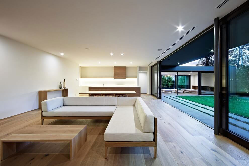 While minimalist interiors are designed in bright colors, combining white walls and wooden floors and furniture, exterior house colors are kept in contrast. Serious and incredibly elegant tone of dark brown color continues from the gate and flows all around the house. While ground floor glass walls are left uncovered, glass walls on the first floor are covered with sliding structural wooden shades, perfectly blending with house color. The whole wood, brown concrete and glass atmosphere was fulfilled with lots of vegetation around the house, specially in the swimming pool area.