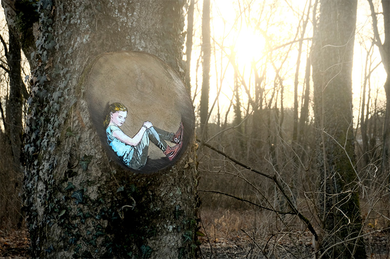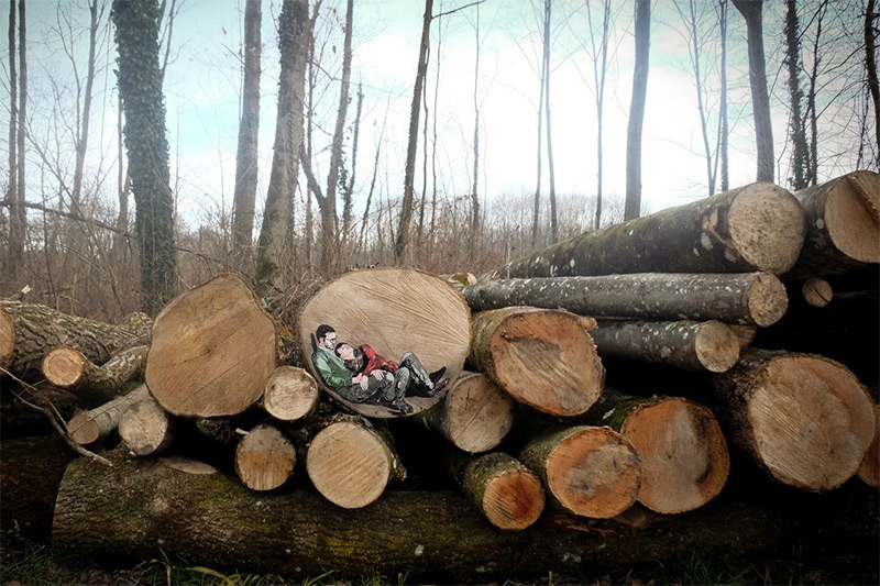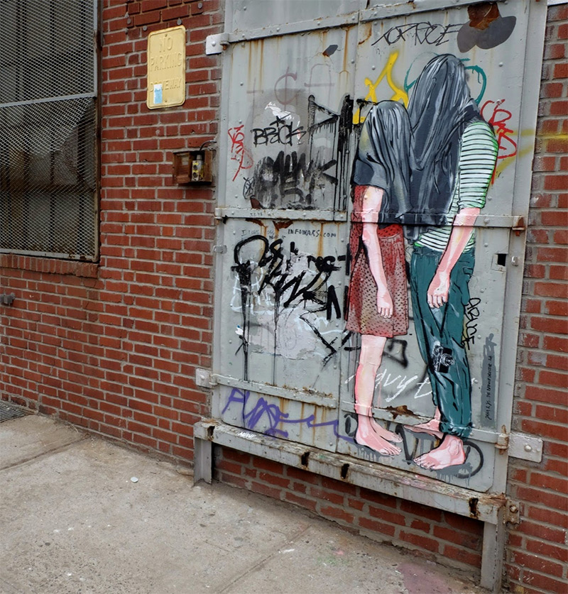 Jana & JS are a street art duo currently based in Austria who specialize in detailed stencil work, frequently depicting people with cameras or couples sharing intimate moments. Shown here are a few pieces from recent stops in the German countryside and Brookyln, see much more on their website and on Facebook. (via Hi-Fructose, StreetArtNews)